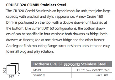 The Isotherm Cruise 320 COMBI Stainless Steel Fridge/Freezer is a large 11 cubic foot marine refrigerator that fits the requirements of boaters looking for large capacity marine-grade performance in a fridge/freezer. Thanks to the modular concept, different combinations can be accomplished including all-freezer double drawer on the bottom or a fridge/freezer double drawer on the bottom.
