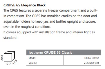 The Isotherm Cruise 65 Elegance is a 2.3 cubic foot marine refrigerator (65 liters) available now in two colors: Silver and Black. The CR65 Elegance Silver features a brushed aluminum panel and the CR65 Elegance Black has a gloss acrylic panel with 3-side black flange.