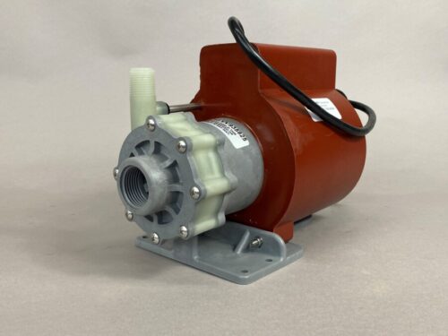 March Pump’s industrial TE-5M-MD is an American seal-less centrifugal magnetic drive pump ideal for marine applications. It is capable of generating a maximum flow of 17 gallons per minute at 4 feet, and its maximum head is 29 Feet (12PSI). It is capable of 50,000 BTU per hour. The standard wet end (the materials that come into contact with the solution) is composed of Noryl, Polypropylene, Carbon, Viton, 316 Stainless Steel, Ceramic, and Ceramic Magnet. The inlet connection is 1 inch female pipe thread, and the outlet is 1/2 inch male pipe thread. The standard motor is a 1 Phase 60 hertz 115/230V and 50 hertz 110/220V 0.2 horsepower totally enclosed fan cooled motor. There are performance differences between the hertz options. The pump can be purchased with the motor’s standard conduit box, a 72 inch cord and 115V plug, or a 72 inch 230 cord. The maximum internal pressure the pump can tolerate is 50PSI, and the maximum liquid temperature is 190 Fahrenheit or 87 Celsius.