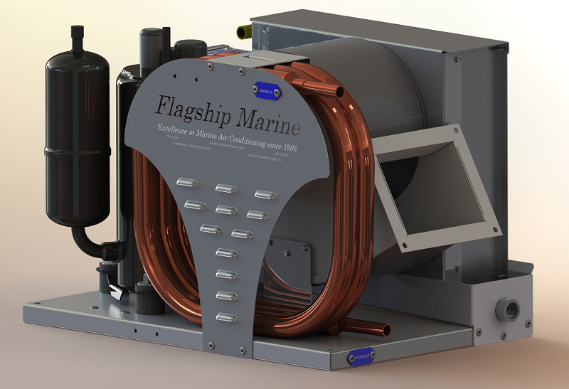 Completely self-contained, these quiet and powerful units need only a power supply line, 15 GPM of seawater (or freshwater with a keel cooler or heat exchanger) and a condensate drain.