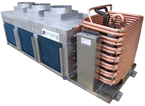 This 15 ton (180,000 BTU) unit pumps out more than 7,500 CFM of air conditioned air with three blowers, six evaporators and a huge condenser assembly, which results in a low compressor head pressure and amp draw. Each blower is fitted with a 12″ collar for ease of ducting. The single Copeland scroll compressor is staged to start a few seconds after the blowers to minimize the start up surge, even though with a scroll compressor the start up surge is very minimal. Optional condenser manifolds result in a single sea water in and out connection, and the optional refrigerant gauge package lets you monitor the operating conditions of the unit immediately.
